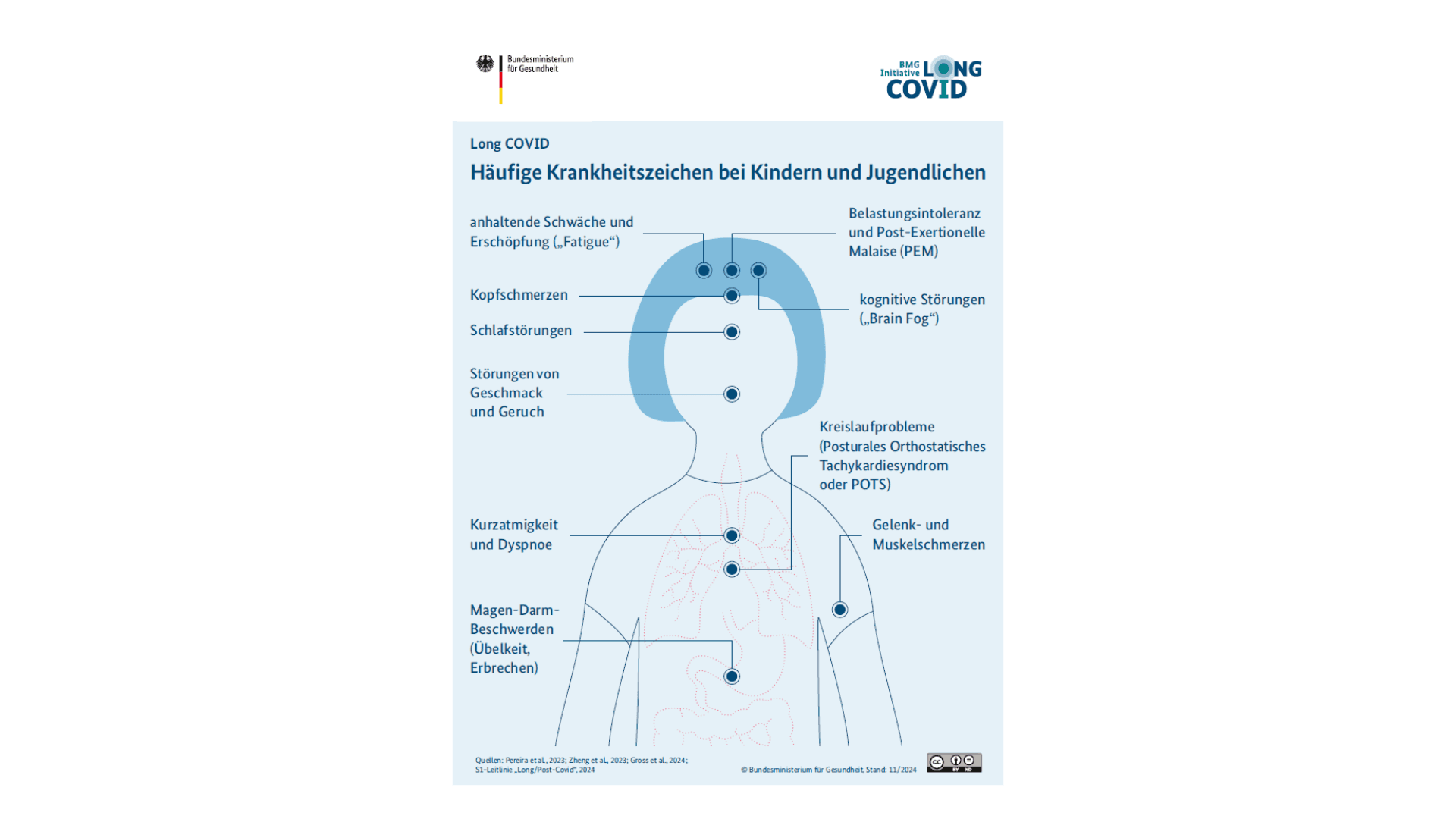 Diese Infografik bietet eine Übersicht über häufige Symptome bei Kindern und Jugendlichen mit Long COVID. Sie eignet sich beispielsweise für Präsentationen oder als Aushang in Ihren Einrichtungen.