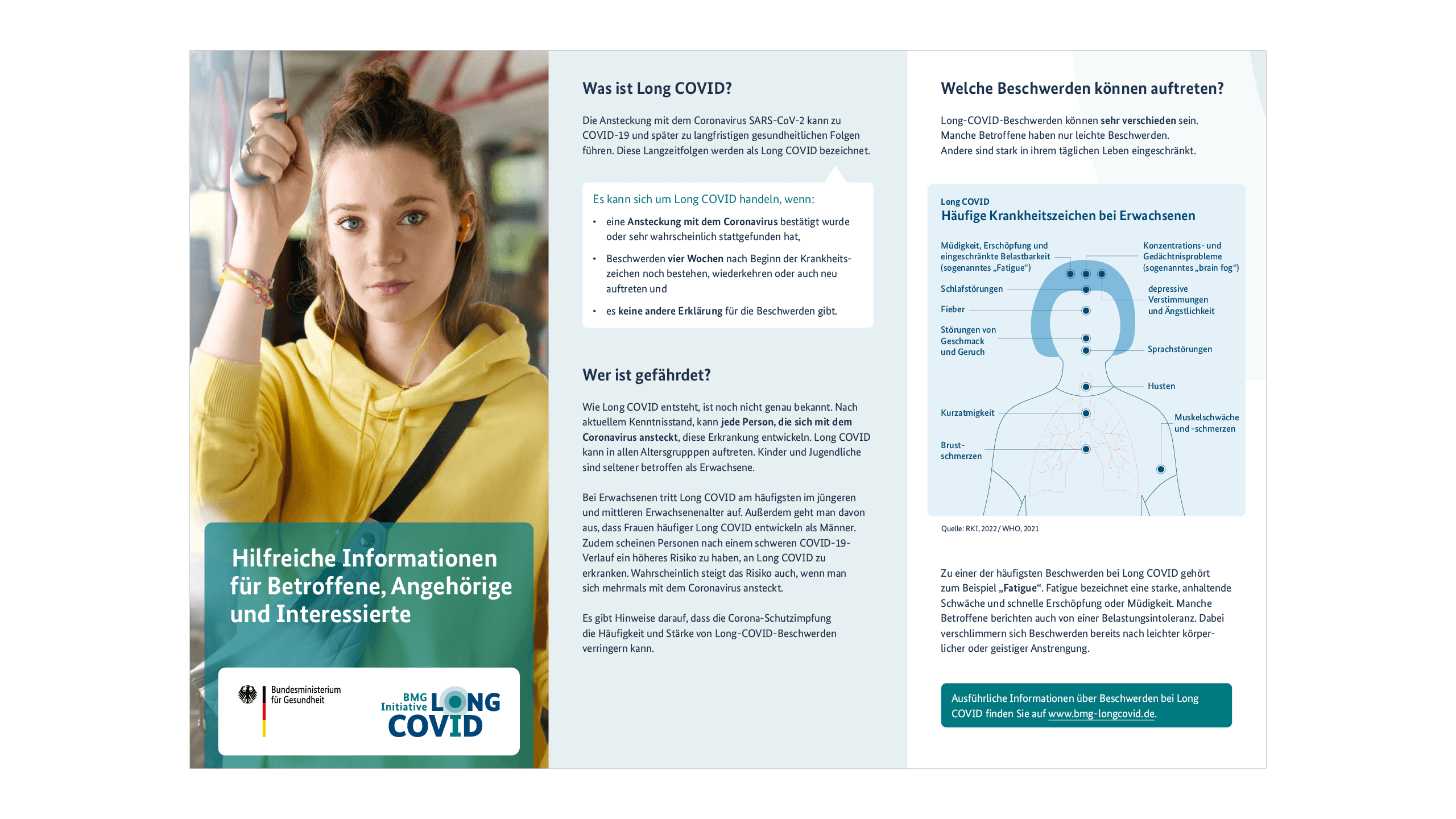 Auch das Bundesministerium für Gesundheit (BMG) unterstützt die Forschung zu Long COVID. Ziele dabei sind, die Krankheit besser zu verstehen und ihre Häufigkeit genauer zu erfassen. Außerdem soll eine bedarfsgerechte Versorgung sichergestellt werden.